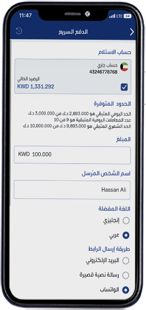 استلم الأموال من أي حساب في الوطني أو البنوك المحلية الأخرى بخطوات بسيطة عبر هاتفك النقال مع خدمة الوطني للدفع السريع، وذلك من خلال إرسال رابط الدفع عن طريق رسالة نصية قصيرة، البريد الإلكتروني أو الواتساب.